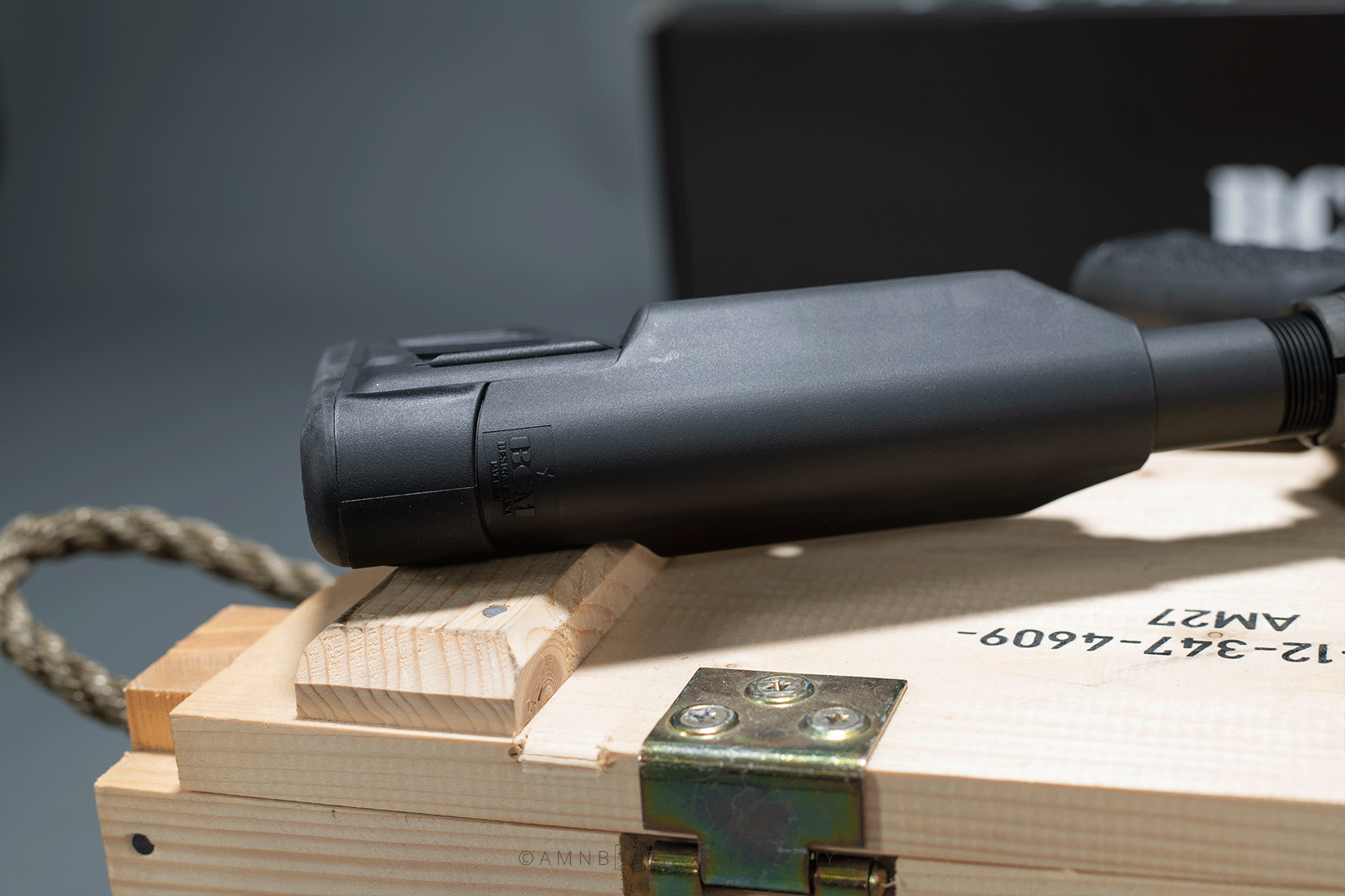 The rubber Butt-Pad is structured to provide you a solid grip while shouldering the MCMR and it releases itself to give you access to the battery compartment by only pushing the two pins on the sides.