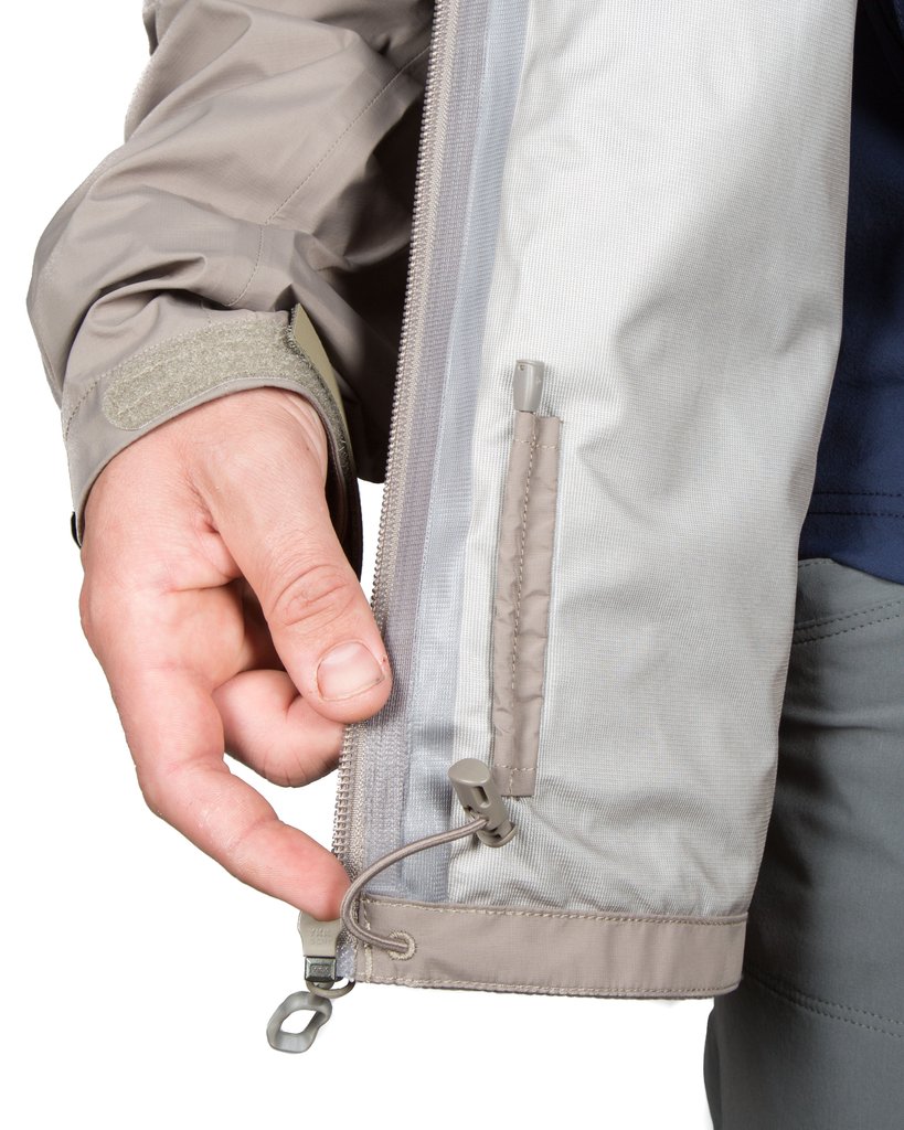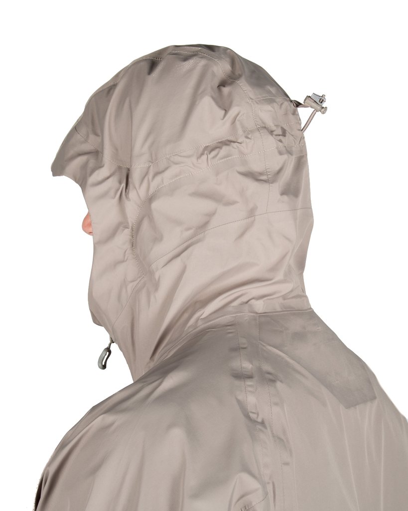 - Seam-sealed, waterproof full zipper jacket with welded seams, adjustable crown hood, adjustable front hem draw cord, elastic back hem and articulated elbows