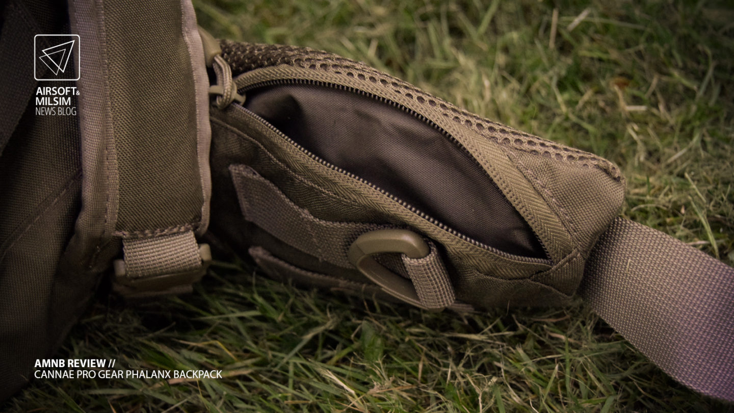 Facing the back of the backpack, you will find an open carry pouch on the left with molle webbing running alongside the length of it and the backpack. This pouch is large enough for carry a 1.2 litre bottle, a hand sized radio, or a 7.62 magazine (smaller calibres will fit of course). You can also find a hole at the bottom to help with any water that may find its way down the open pouch compartment. It is recommended to use inserts or equivalent to maintain any equipment you decide to put in this pouch unless they are light weight and can be easily retained if the backpack is flipped upside down.