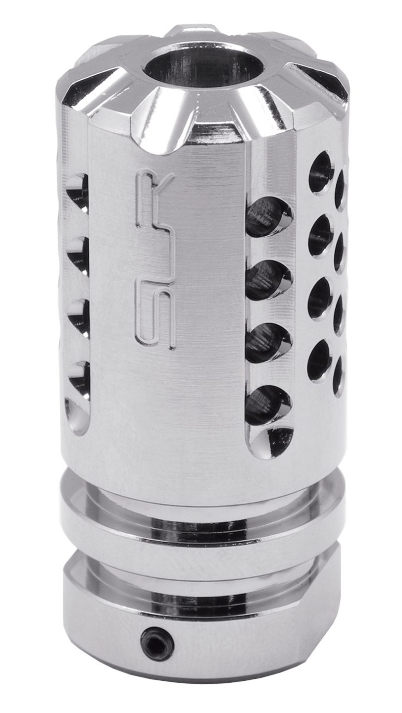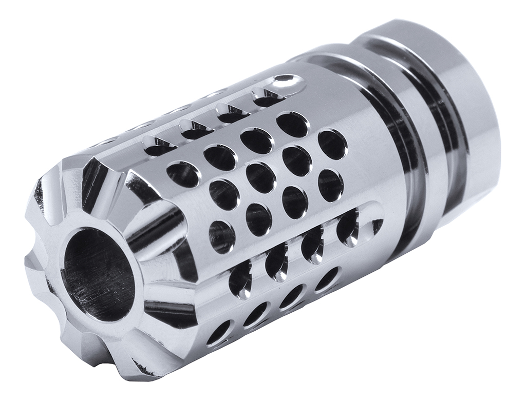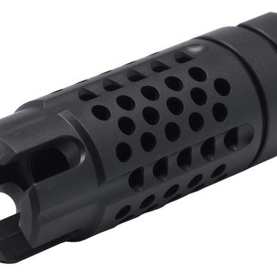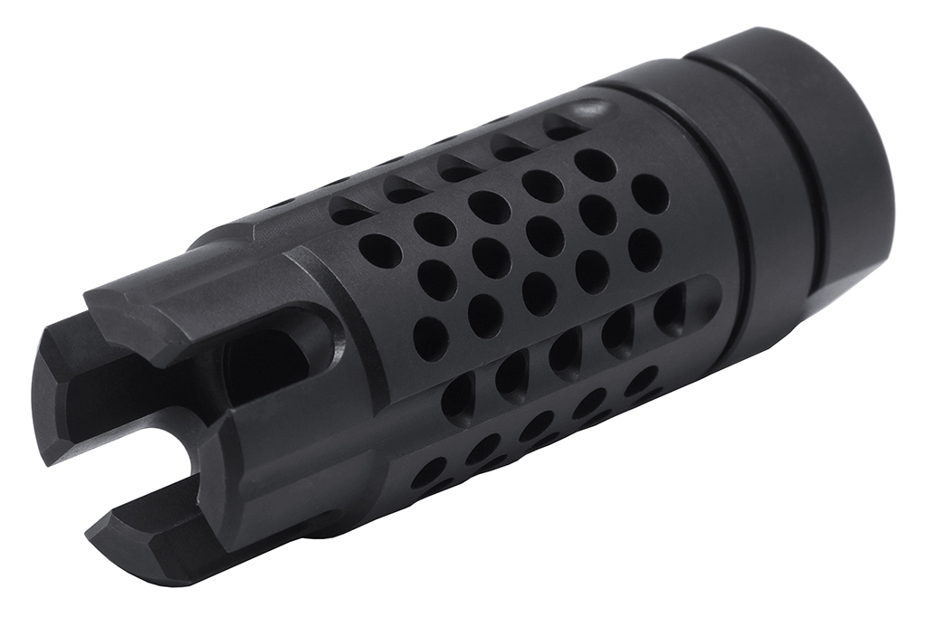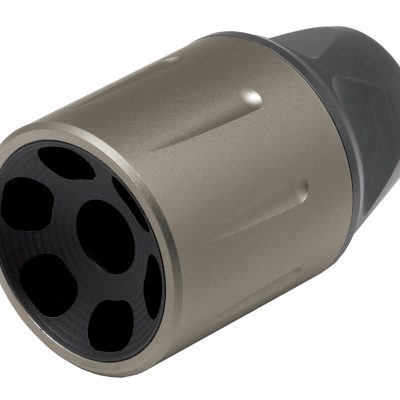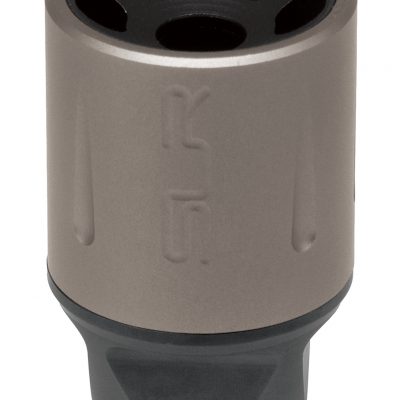The Synergy Comp is the big brother to the Synergy Mini Comp. Besides being able to redirect gases to reduce flash and recoil on a firearm, the Synergy Comp has 4 prongs at the muzzle end to further mitigate flash on a firearm by redirecting excess gases through the space between the prongs. The Synergy Comp will also come in titanium and black colours, and in -14mm threading.