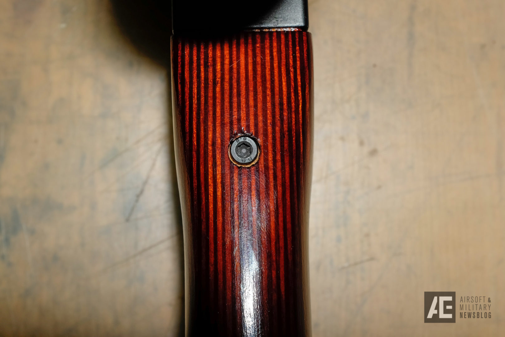The Wood looks good, a bit too dark and red for my taste. The varnish is very thin and fragile – I dare you scratching it! Don’t try to weather the wood, the varnish will simply fall off. The problem is, the varnish doesn’t merge with the fibres of the wood – it’s more like a top coat but this seems to be quite legit on real AKMs, You can see it on the photo underneath. It shows where the varnish has fallen off from beeing touched by the sling hook. This has happend during the first game with the gun. It’s not a bad thing considering that this will create a unique “used-look”.