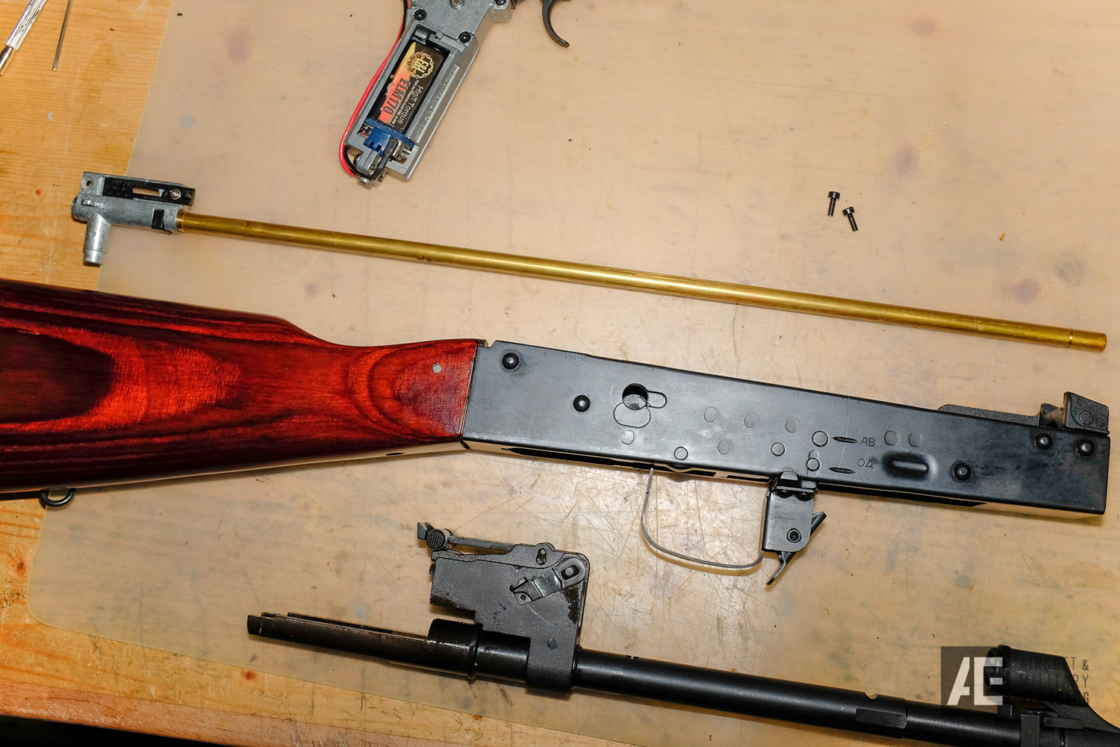 The E&L AKM has one of those tight rear sight blocks and I wasn’t able to fit my 9.9V LiFePo in it. It is 18.3mm wide and most LiPo batteries have at least 18mm, mostly 19mm in width. If you are reading this E&L, please, make them bigger. It’s a pain in the arse to sand down a steel rear sight block.