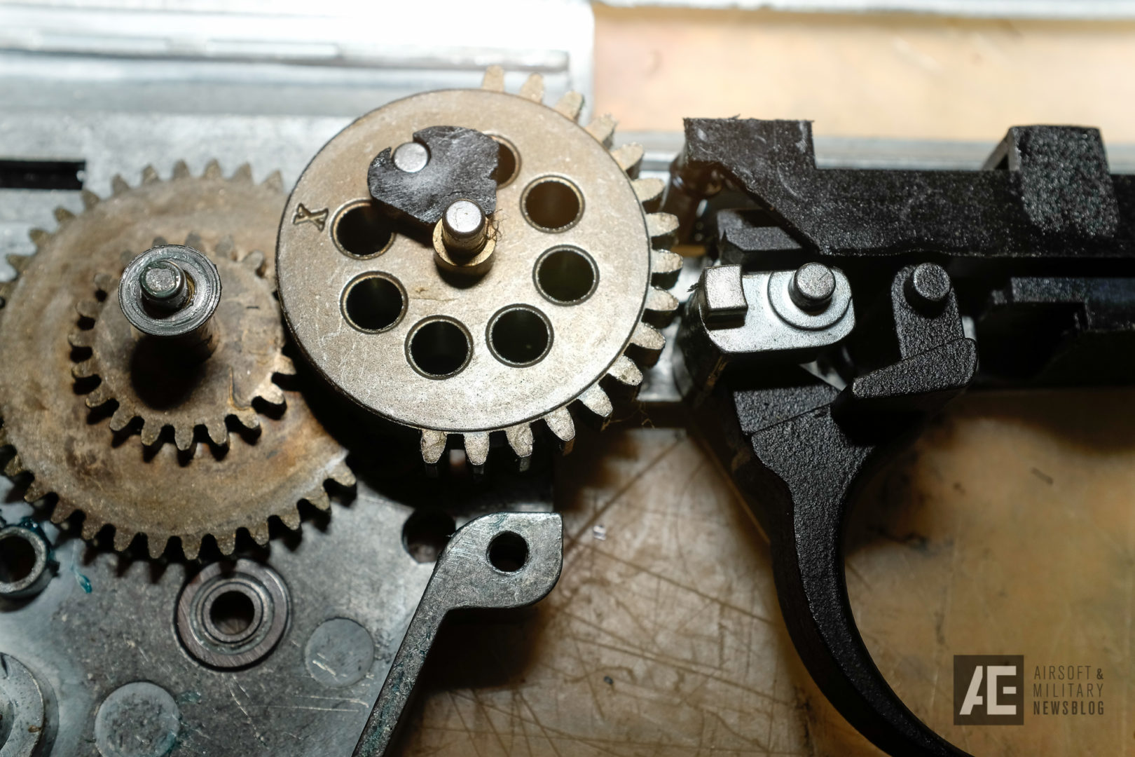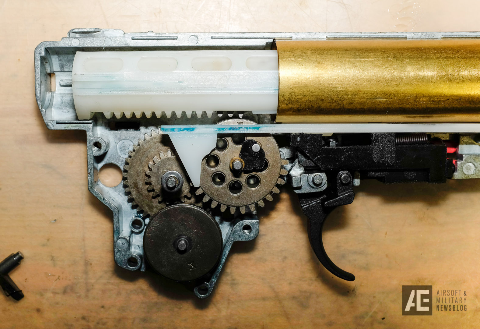 When you open the gearbox, there’s nothing special on first sight. It features a bearing spring guide, a polycarbonate piston with a “silent” style piston head (no bearing, wich isn’t necessary as long as the spring guide has one) with matching cylinder head, standard brass cylinder (full type), steel gear set by XYT, a delayer chip on the sector gear, a standard nozzle. The spring seems to be a short one wit a lot of power.