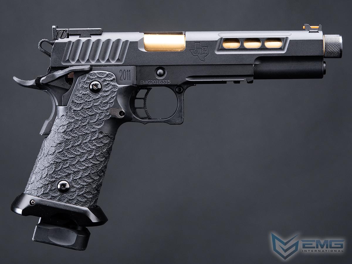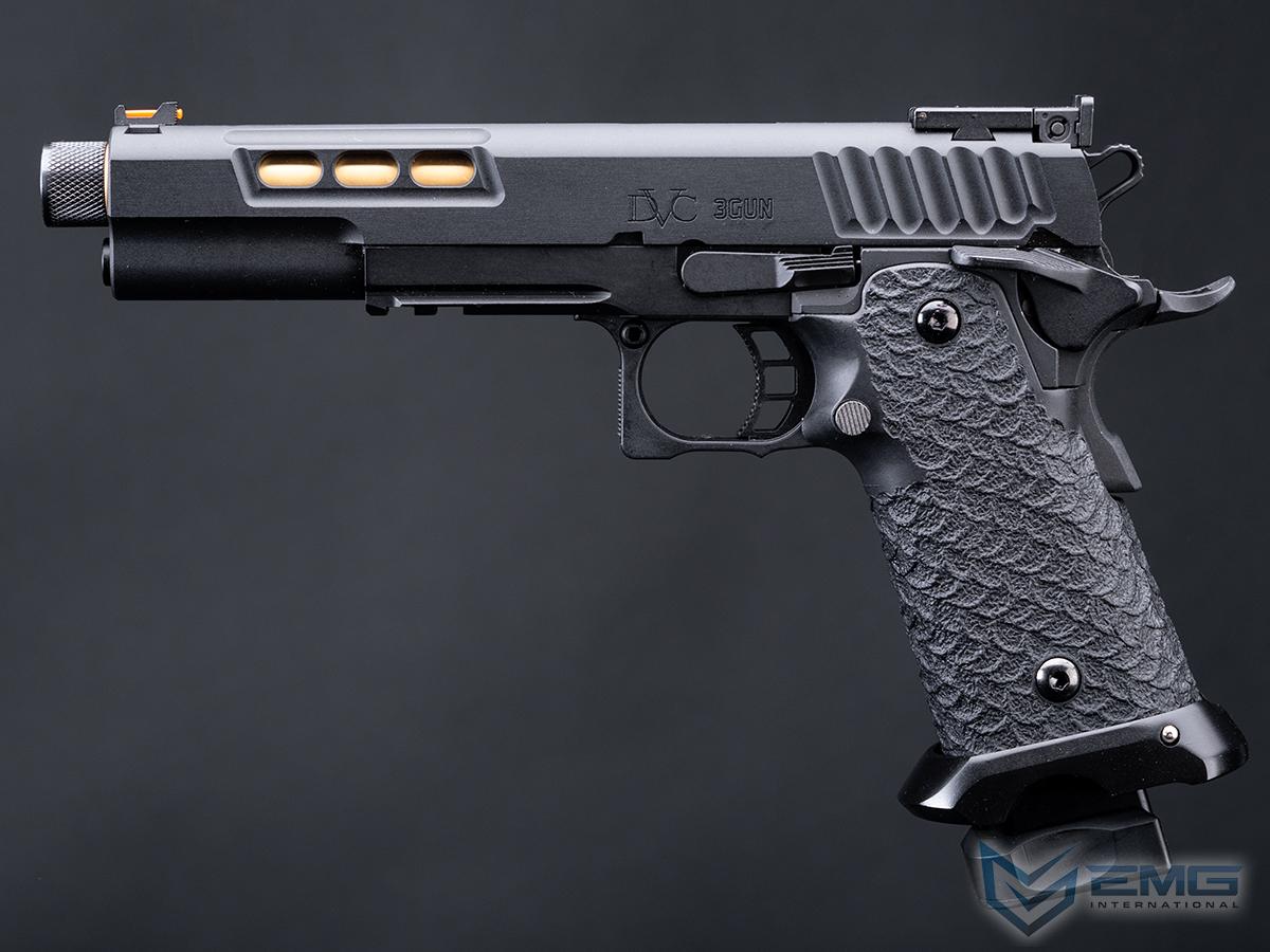 The EMG Arms x STI International DVC 3-GUN 2011 has a CNC machined aluminum frame with Molded DVC Stippling pattern provide a comfortable, slip-resistant grip. The slide has lightening cuts to help it cycle faster with less felt muzzle flip.