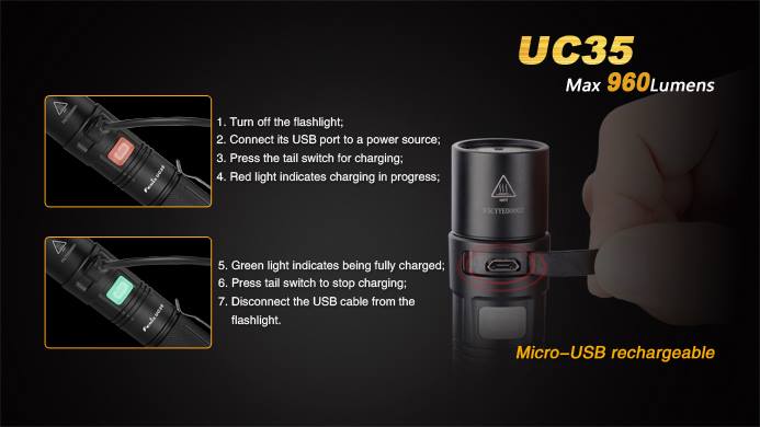 The Fenix UC35 rechargeable flashlight combines high intensity with reliable Micro-USB charging and it’s compatible with various batteries. Tactical tail switch offers momentary-on and side switch for output selection. With an optimized beam pattern, the UC35 offers six outputs including strobe mode to cover from daily use to outdoor and professional use.
