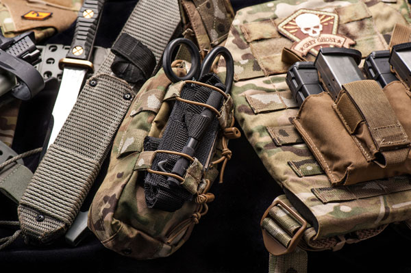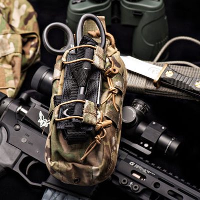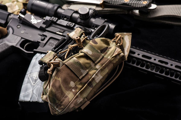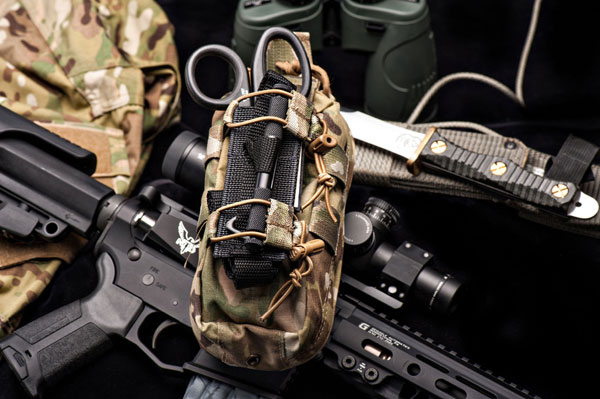 The Slim Medical Pouch itself is built of 500 Denier Cordura® nylon and attaches with two (included) Malice Clips®. This pouch was designed to carry the following items (note: they are not included with pouch purchase), but can of course handle substitutions and changes.
