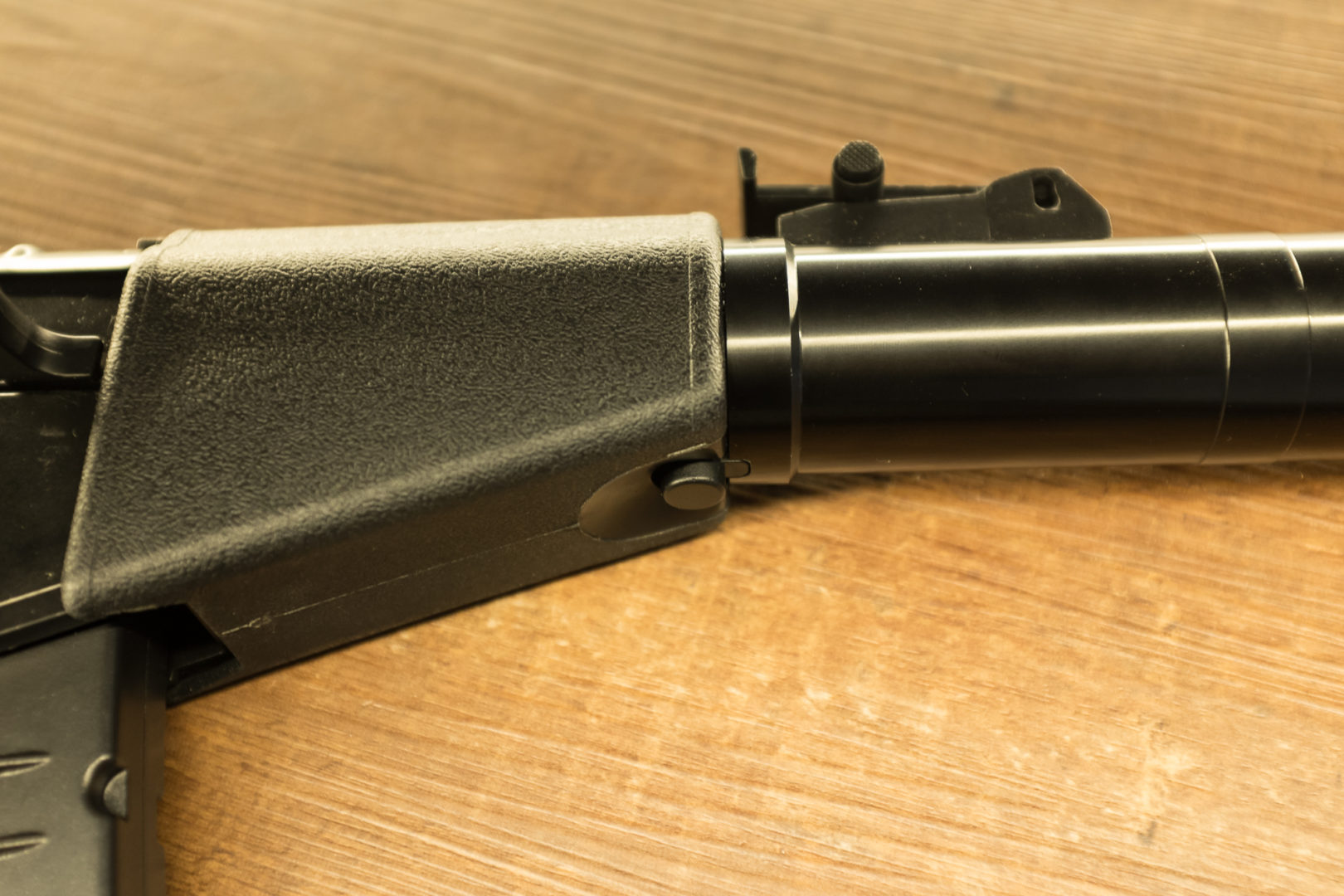 The outer barrel/silencer has minimal movement but since it is meant to be quickly removed by pushing the knob on the bottom of the hand guard, it doesn’t bother at all. The outer barrel has s nice texture on the front end, it feels almost like a Maglite.