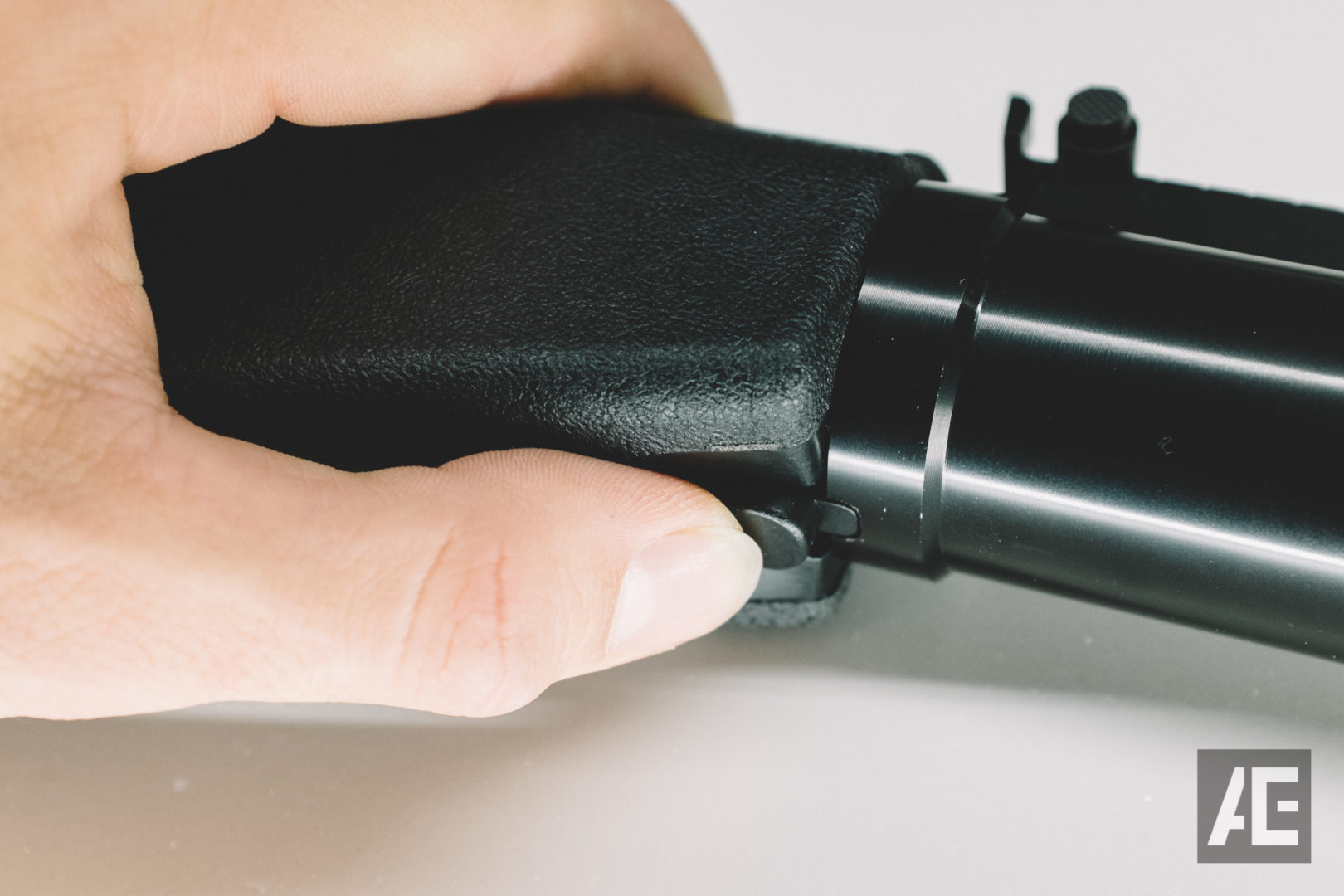 Be sure to tighten down the screw located on the bottom of the grip. it will get loose from time to time and the stock starts to jiggle a little bit. Speaking of the grip, due to the fact that the motor and motor housing are fitted inside the grip, it feels quite big and bulky with rather sharp edges that can hurt small hands like mine when holding firmly and especially when holding over a longer time period. If you have bigger hands, this won’t be such a big problem.