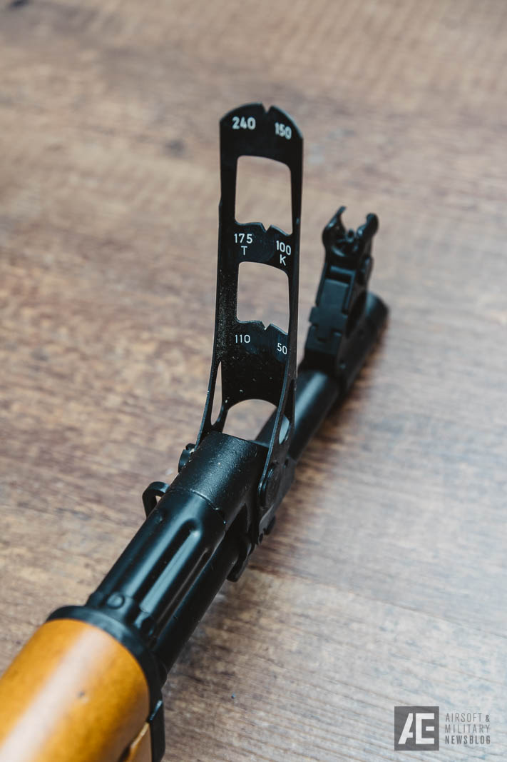 Das Gewehrgranatenvisier besteht aus Stahlblech, sitzt am vorderen Ende der Gastube und lässt sich einfach auf- und zuklappen. Es rastet sauber ein und wackelt nicht. Auf der Innenseite befinden sich die Entfernungsmarkierungen zum Visieren der Gewehrgranate. Der entsprechende Flashhider, der benötigt wird um eine solche Granate abfeuern zu können, ist separat erhältlich. Eine Granate kann die LCT M70 natürlich nicht abfeuern, das ganze ist nur Deko.