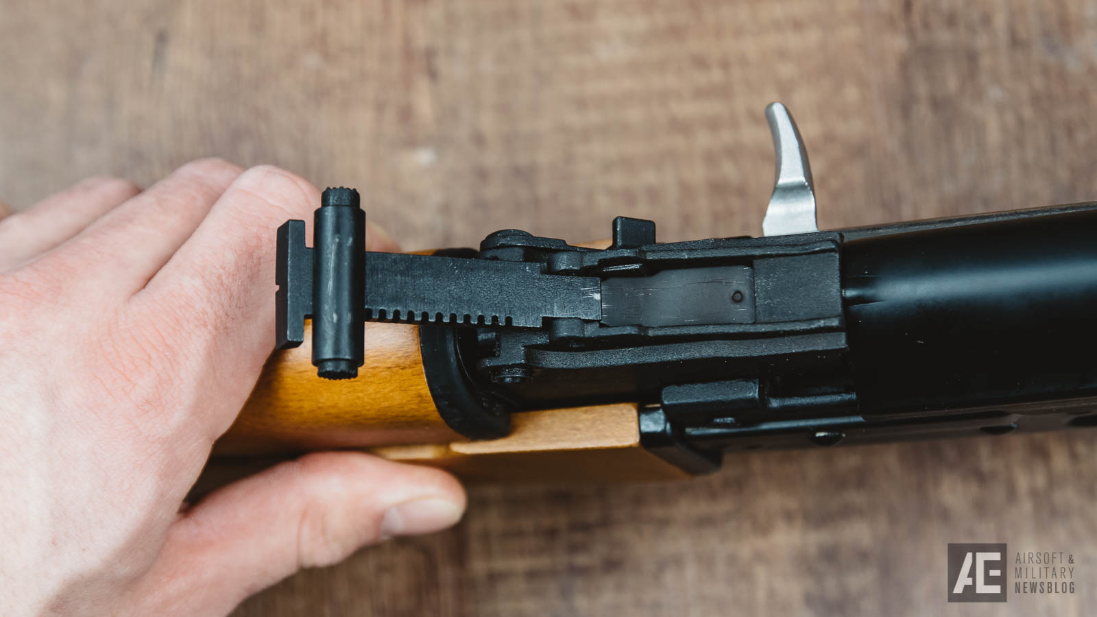 Das Hop-Up befindet sich da, wo es sich bei allen anderen AKs auch befindet – hinter dem Repetierhebel. Einfach zurückziehen, halten und das klassische AK Hop-Up verstellen. Hebel loslassen, am Sound erfreuen, fertig.