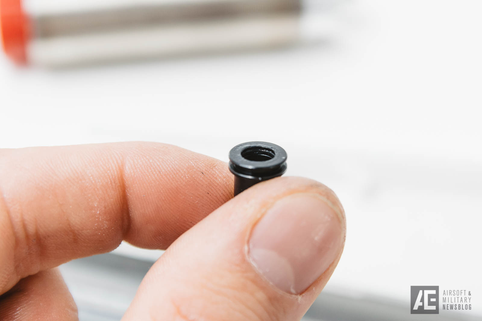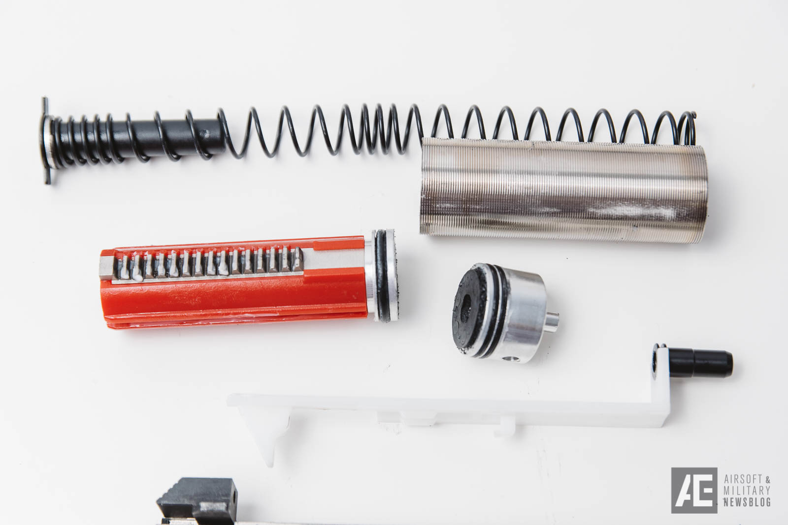 Im Inneren werken eine Feder, die sich irgendwo im Bereich von SP120 ansiedeln dürfte, ein Spring Guide aus Kunststoff (den hätte man ruhig aus Metall machen können bei der verbauten Federstärke), ein Edelstahzylinder, ein Edelstahl Cylinder Head mit doppelter Dichtung, ein Full Teeth Piston mit Stahlzähnen (sehr löblich!), eine Tappet Plate aus Kunststoff und ein Nozzle mit O-Ring.