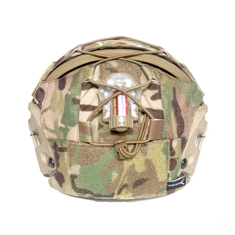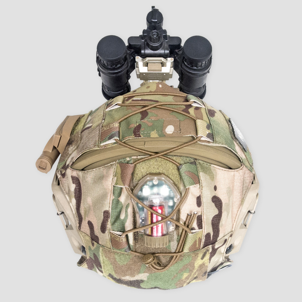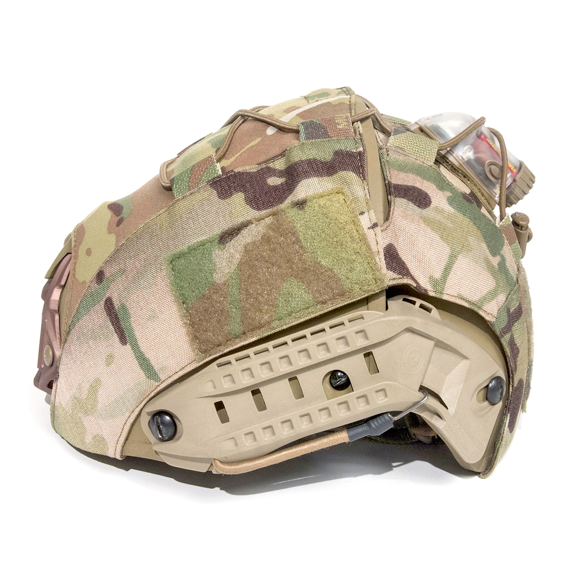 Camouflage and protect your helmet. Durable four-way stretch fabric front accommodates a wide range of night vision mounting options – easy removal without requiring unscrewing the NVG mount. Signal strobes, electronics and other items are retained with an adjustable 1/8th inch US GI MIL SPEC bungee cordage system. Cover attaches via Velcro®. Size corresponds with helmet size.