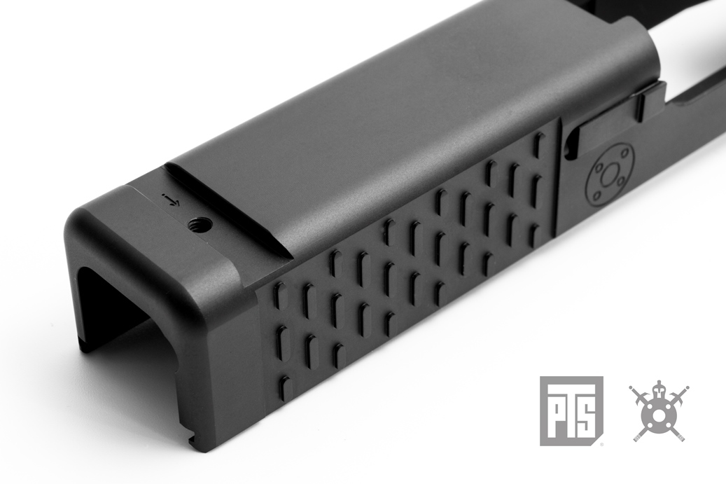 The PTS BattleComp G19 Custom Slide and Barrel Set consists of a minimalistic but very distinctive appearance where the front and rear serrations are specifically designed to mimic the trademark pattern of the incredibly popular BattleComp muzzle device ports.