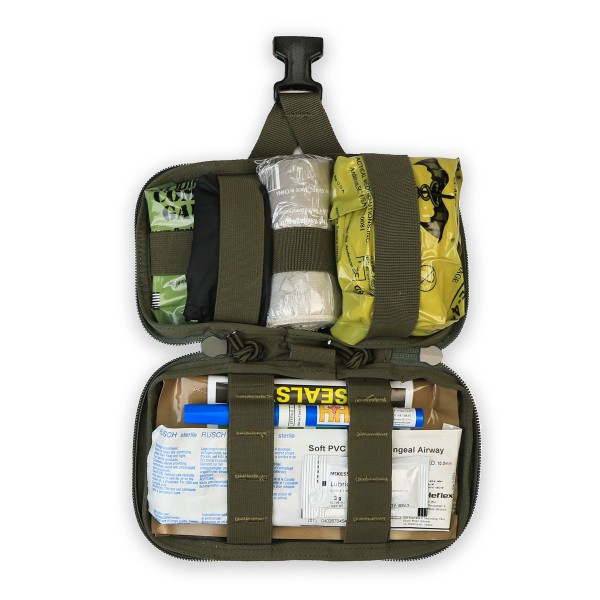 Compatible with MOLLE or belt attachment, the kit can be worn overtly or covertly while maintaining a low-profile carry. The center red identifier pull-tab allows you quickly detach and open the kit under stress.