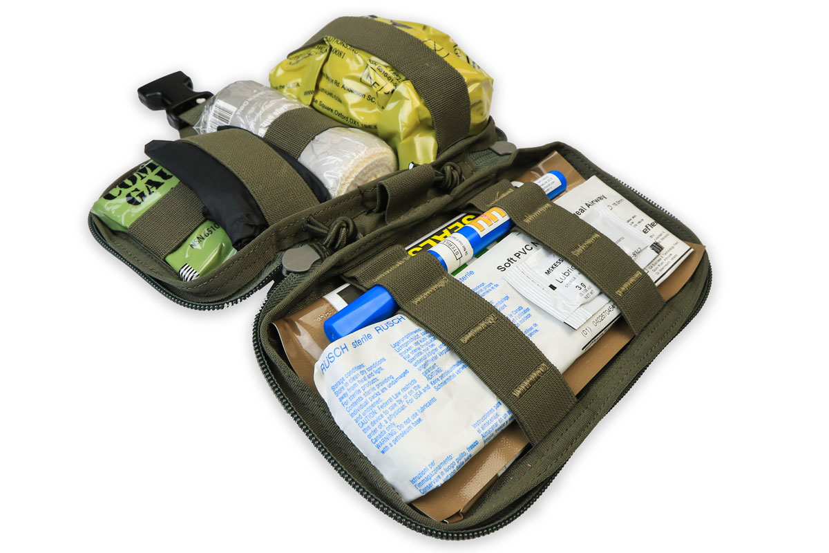 The interior is built with multiple elastic bands and slots for securing various sized pieces of equipment, including combat gauze, NPA’s, bandages, and other required items.