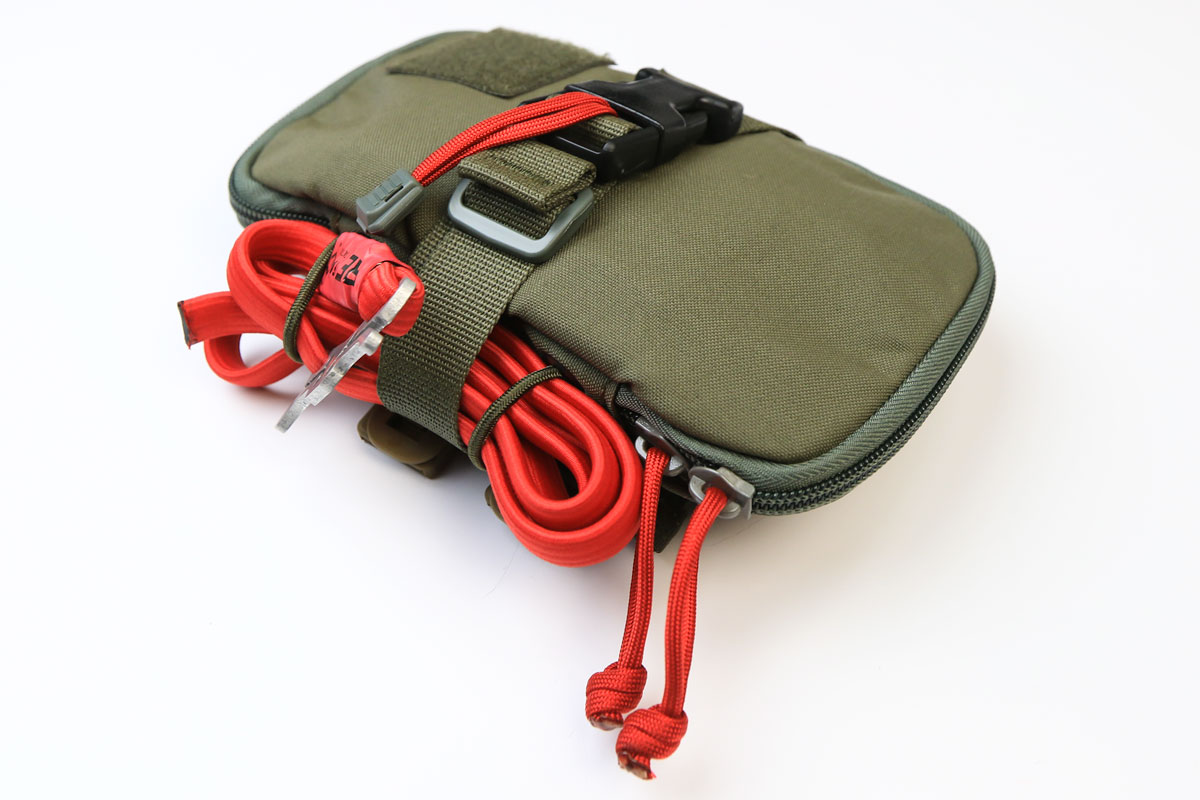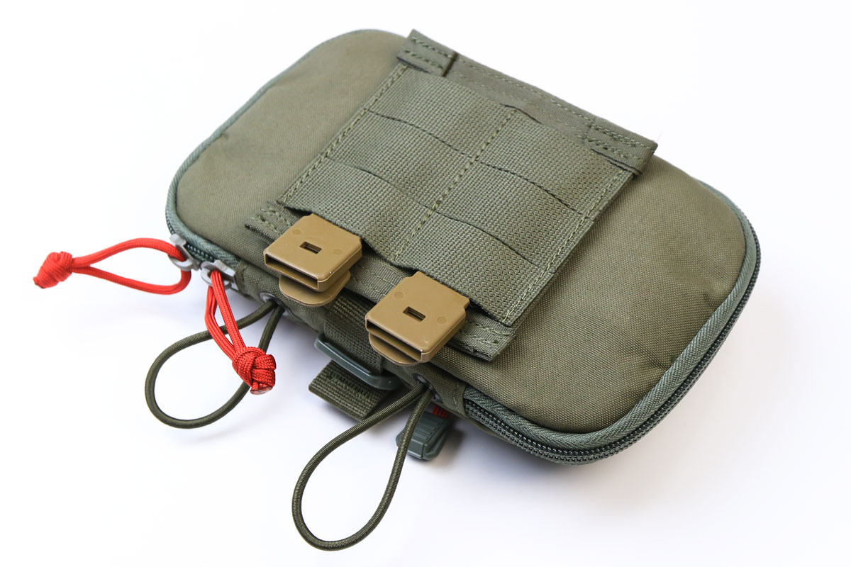 The outside features a large carrying tab down the center of the pouch for ambidextrous access, and also includes velcro adhesive in addition to the buckle strap for added retention. Additional bungee straps have been included for the addition of a tourniquet on the bottom of the pouch.