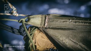 As mentioned, this tarp is not just a tarp. Featuring small game changing details which reflect BEGADI‘s commitment to perfection. Let’s start with the reflective coating. Looking at the previous image, on the bottom you can find an interesting design called “the reflector”. Any tarp can be used like this but with this one, you get the maximum from your camp fire. Placing the shelter so the wind doesn’t blow through the sleeping area, you get a heat radiating wall, which keeps you warm in the harshest of conditions. For longer stays, you might also want to bring some clear PVC foil to suspend between the fire and the sleeping area. Closing this side with this foil will create a green house effect and will keep the shelter warmer, longer.