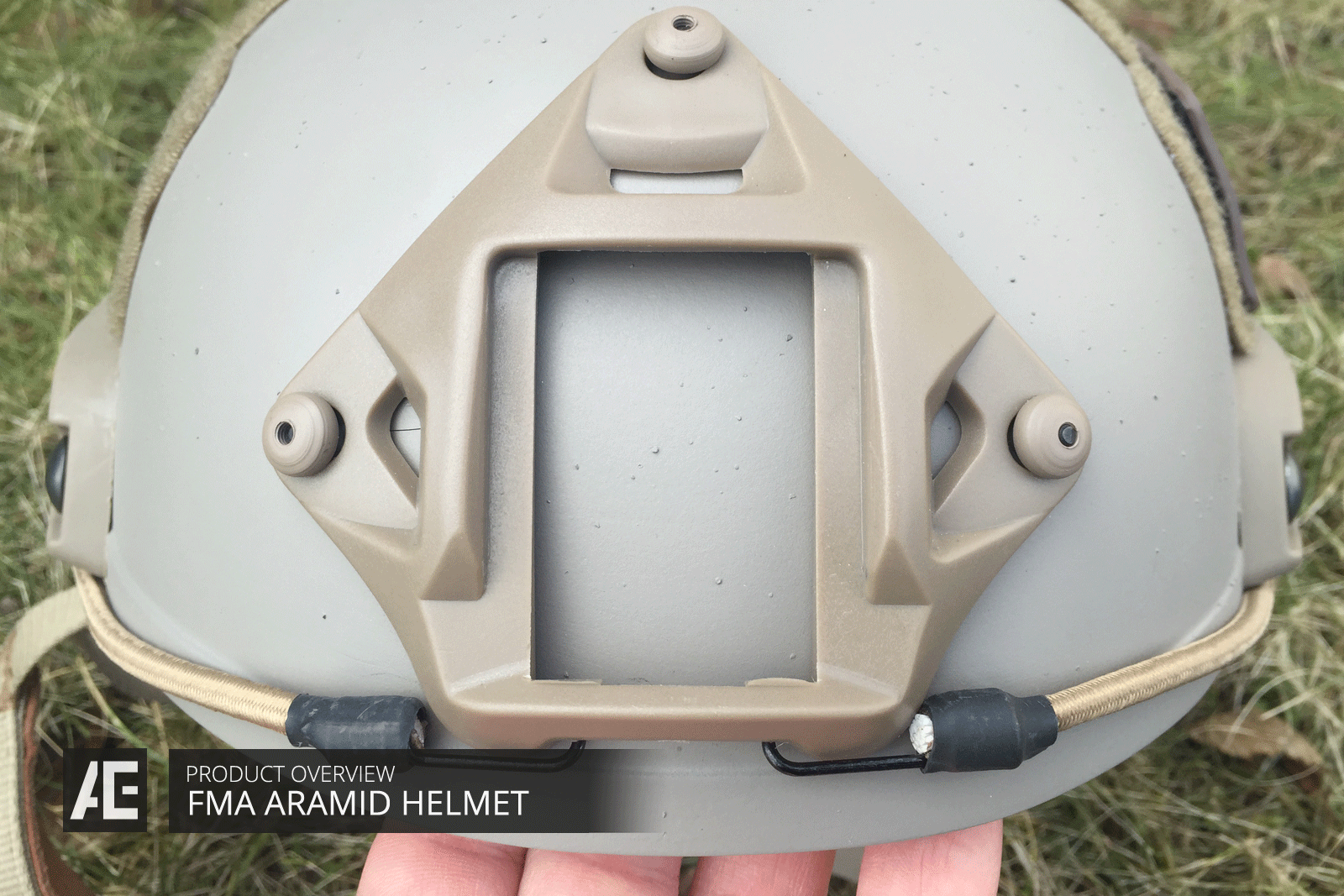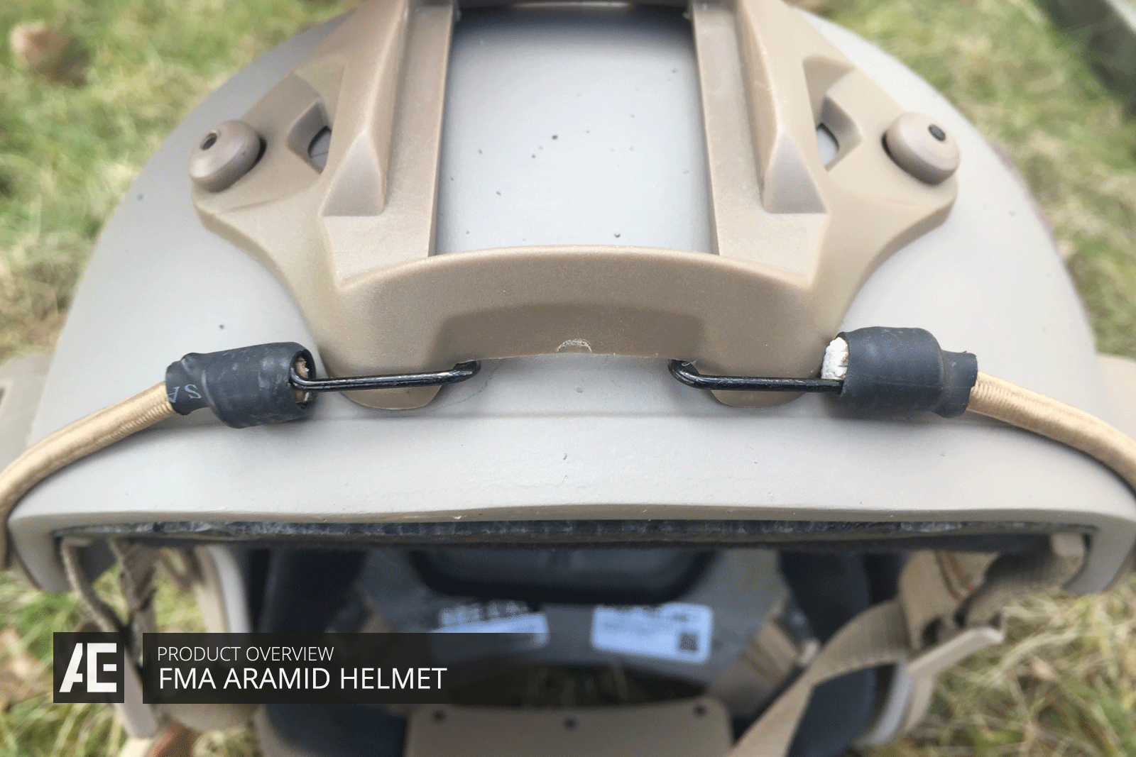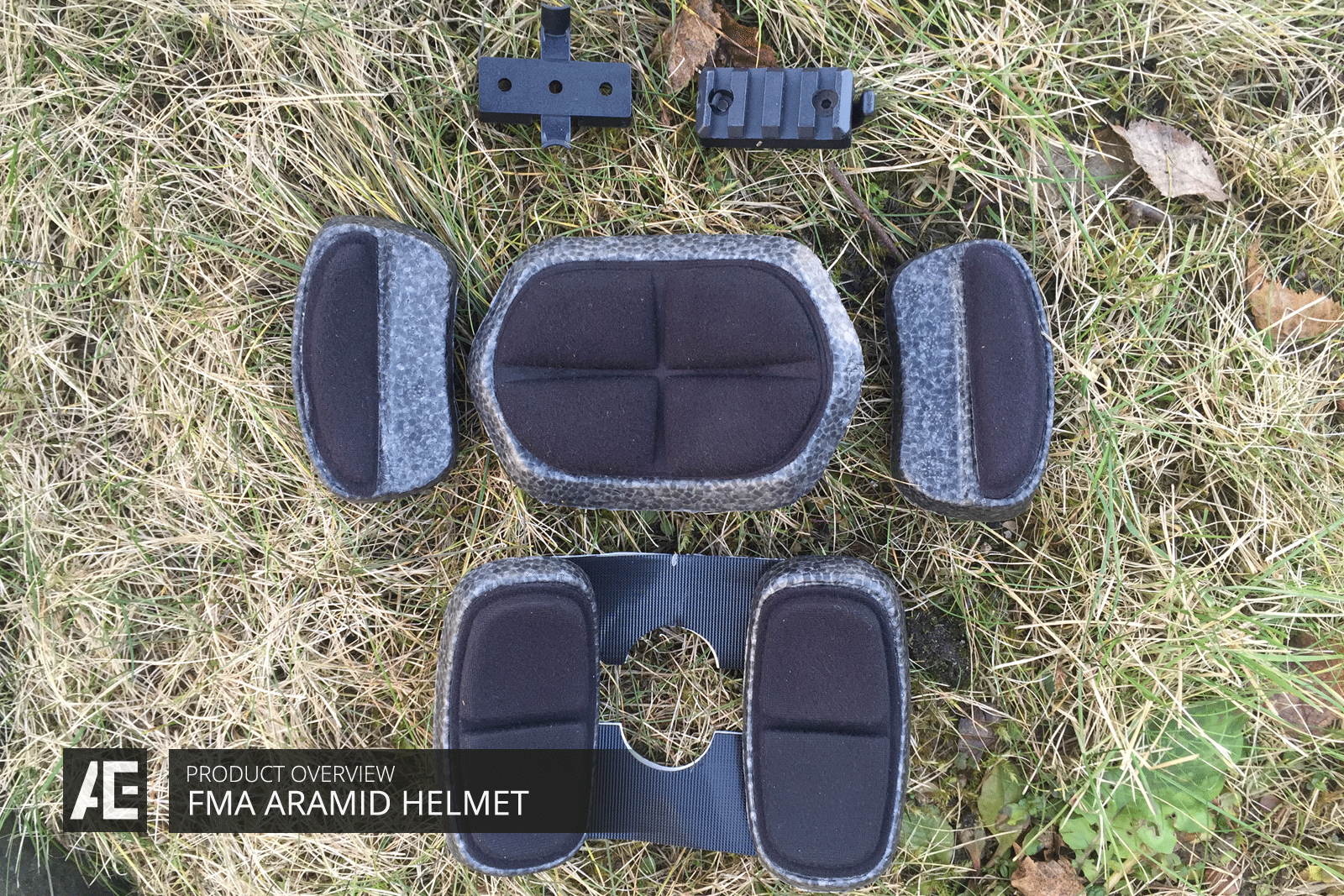 Beside the Aramid Fiber, FMA uses several other materials for the internals, the NVG shroud, Picatinny Adapter, Wing-Loc Adapter, Goggle Swivel Clips & the side rails which all come with the helmet. For these parts ABS plastic, styrofoam, fleece cloth on the parts who sit next to the skin, hook and loop points/strip inside the shell which hold the side & back pads in position as well velcro at the outer-shell are used. So you can add all your fancy patches, strobes, lights etc. on it.