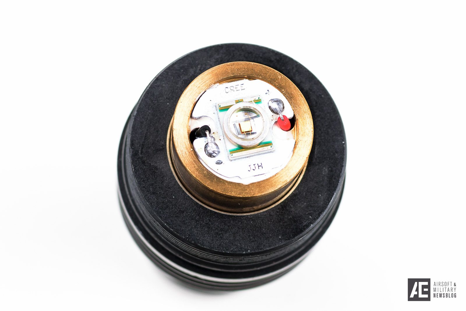 The LED module sits inside a thick brass ring, that helps cooling the module. The lamp head also features a ring with metal teeth. If you could/should smash a window with the lamp or press it against any surface to stabilize your weapon? Probably not. It looks cool and adds an aggressive look the the lamp.