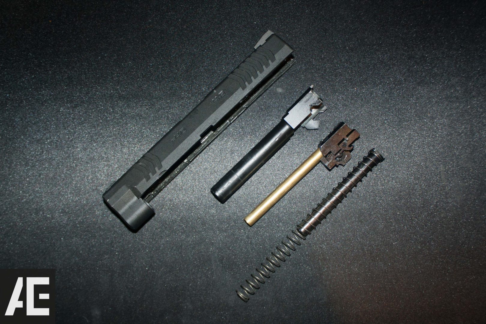 To disassemble the pistol, the take down lever needs to be turned 90 degrees clockwise and the slide will slide forward, off the frame. The slide can be disassembled by first taking the spring guide out and then the inner barrel and the outer barrel. You can also access the hop up dial when you have separated the slide from the frame. You can find more pictures of the internals and the rest of the pistol in the gallery at the end of the review.