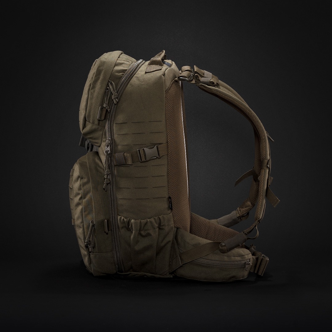 Laser-cut MOLLE on the front and sides mean you can combine it with other gear. With a main compartment that opens completely and the special zipper guides it’s possible to use the backpack as a top loader. The shoulder straps can be adjusted in length in order to wear it over vests.