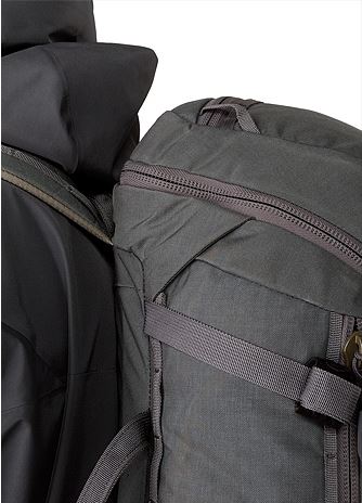 - Two side pockets with hydration ports carry 3L bladder or 1L water bottles; lid has extended top pocket and stash pocket