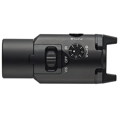 The user transitions from white light to IR without having to remove eyes from the target or alter their controlled firing grip.
