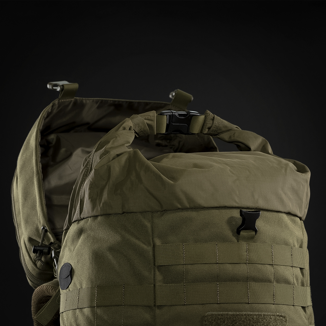 The lid is also removable, so the backpack is closed only with the roll-top snow guard. The hip belt can also be removed and used separately as a Warrior Belt.