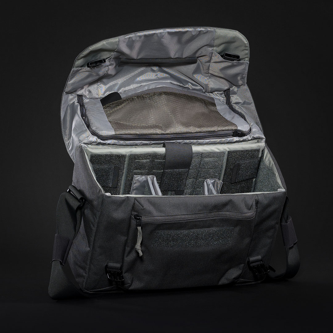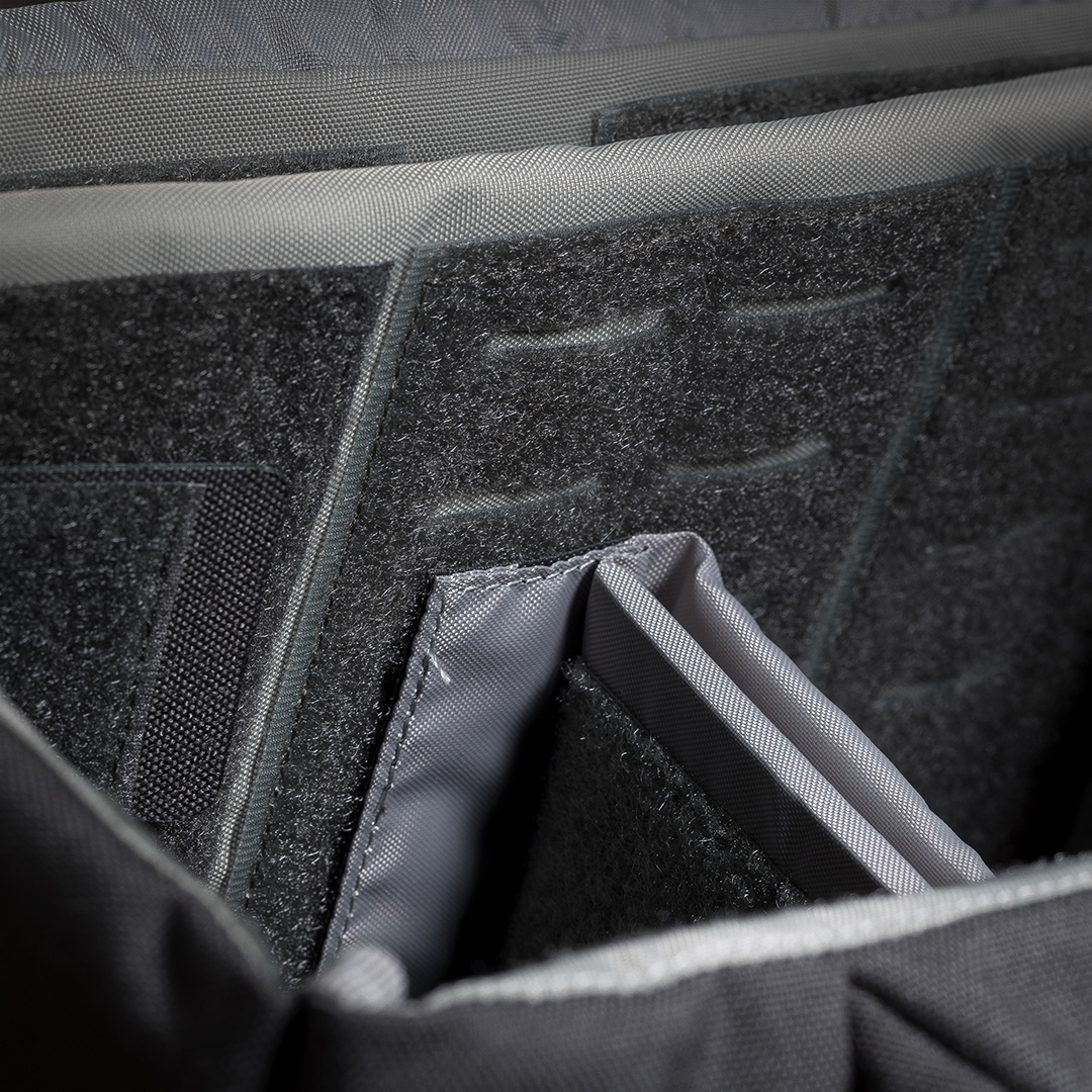 It features a MOLLE hook-and-loop panel on the inside as well as flexible, padded dividers.